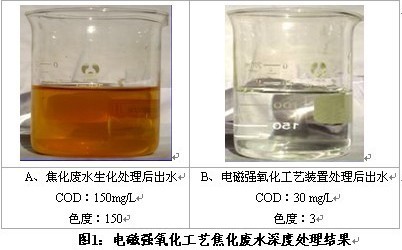 Tuofeng applied electromagnetic-field oxidation on a treatability test of biological treated coking wastewater recharged from Steel-making Plant. The COD in final output water after electromagnetic-field oxidation is less than 50mg/L, chroma is less than 3. Final treated water is not different from normal deion water by eyes.The analytical result is following: